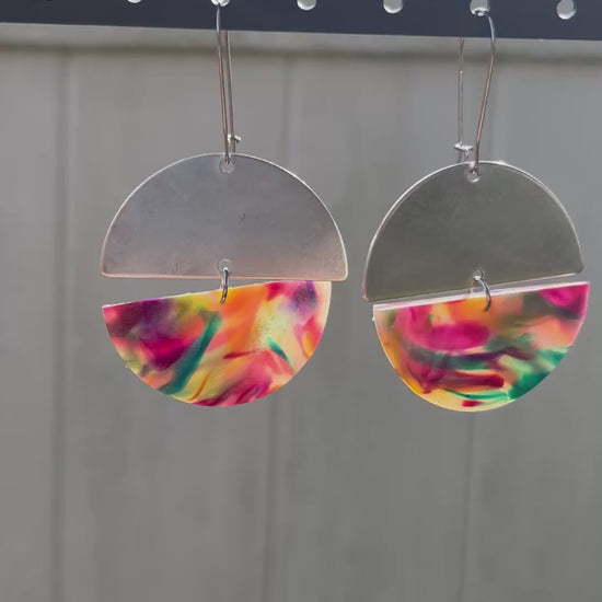 Elevate your style with these stunning Semi Circle Sterling Silver Rainbow Dangles! Featuring genuine sterling silver semi circle plates combined with a semi circle of vibrant rainbow of colors, these handcrafted earrings combine premium quality with playful design for a look that's both elegant and fun.